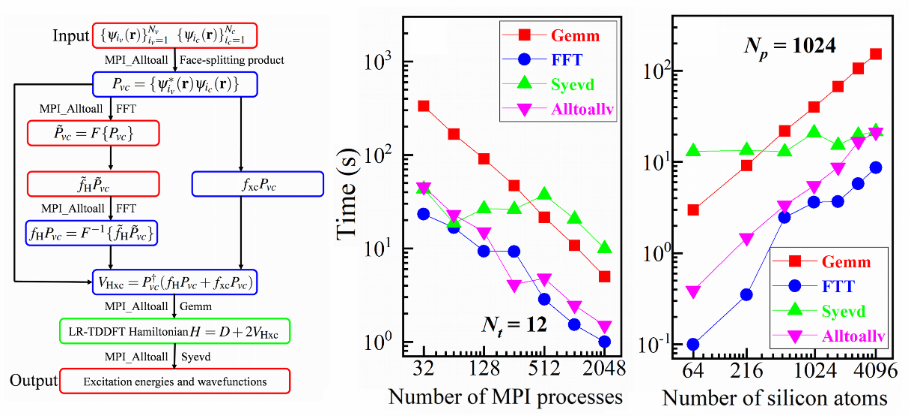 凝聚相体系的光电性质严重地依赖于激发态电子-空穴对(激子)的相互作用。通过基于含时密度泛函线性响应理论LR-TDDFT激发态电子结构计算方法,可以准确地计算体系的激子效应。但是这种激发态电子结构计算速度非常慢,尤其是在高精度的平面波基组下,由于昂贵的多中心积分计算,计算标度更是高达O(N5~N6),计算复杂度大,内存需求多,传统的第一性原理材料模拟激发态电子计算只能处理数百原子的体系。为了解决这些问题,我们提出了针对凝聚相复杂大体系的LR-TDDFT激发态电子结构低标度计算方法,通过插值可分离密度拟合ISDF低秩分解算法,结合机器学习聚类降维算法和隐式迭代对角化方法,可以将LR-TDDFT激发态电子结构的计算复杂度从高标度O(N5~N6)降低至立方标度O(N3)(与LDA/GGA类似)。而且,这种低标度计算方法有利于在超级计算机上实现大规模高性能并行计算(万核以上)。在自主开发的标准平面波计算软件PWDFT中,通过混合CPU-MPI/OpenMP + GPU-CUDA异构并行计算模式,我们计算了包含4,096原子体相硅的激发态电子结构性质,并行计算的规模高达12,288CPU核。最后,我们采用提出的LR-TDDFT方法研究了二氧化钛表面光催化的激发态电子结构性质,揭示了表面氧桥捕获的热空穴对分子解离反应起到决定性作用。