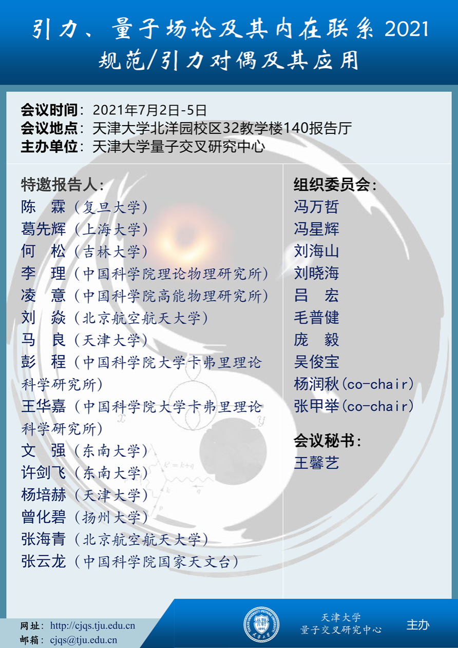 规范/引力对偶将广义相对论、量子场论、量子信息理论和强关联凝聚态系统联系在一起。近年来,这一领域的研究不断取得新的进展。为推动相关领域同行之间的交流合作,天津大学理学院量子交叉研究中心将于2021年7月2日至5日在天津大学北洋园校区召开“引力、量子场论及其内在联系2021—规范/引力对偶及其应用”小型专题研讨会。