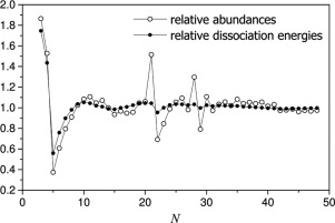 The abundance spectrum of deuterated heavy water clusters has been measured, and relative dissociation energies were extracted from the abundances. The dissociation energies are similar to those of protonated light water clusters, except for a slightly reduced excess stability of the N = 21 cluster relative to the N = 22 cluster. The difference is interpreted in terms of the special geometry of the N = 21 cluster. The absence of a similar effect for N = 28/29 suggests that the stability of the N = 28 cluster is not due to a closed shell structure.