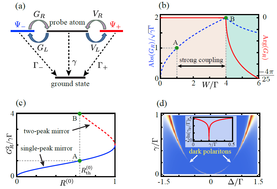 图2. (a) 原子腔与探测原子耦合,(b) 腔-原子强耦合区域,(c) 反射阈值,(d) 暗极化激元
