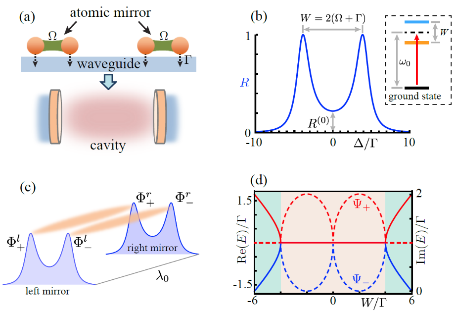 图1. (a) 由耦合双原子构造的原子腔,(b) 双原子的光反射谱,(c) 原子镜散射通道,(d) 宇称-时间反对称保护的原子腔模式