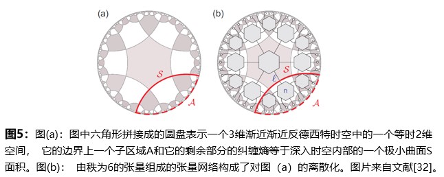 在引力全息对偶中一个非常重要的结论就是渐近反德西特时空中边界上一个子区域的纠缠熵由 Ryu-Takayanagi公式给出[30,31]。根据Ryu-Takayanagi公式,在渐近反德西特时空边界上一个子区域A和它的剩余部分的纠缠熵由深入时空内部的一个极小曲面的面积给出,如图5(a)所示。根据引力全息对偶,连续时空可以被离散化为一个张量网络图表示,如图5(b)所示。能够代表反德西特时空中等时截面的张量网络也被称作“完美张量网络”。利用“完美张量网络”,人们可以获得Ryu-Takayanagi公式的离散版本[33]。文献[32]报道了一个通过模拟全息纠缠熵来模拟量子引力的实验。他们在六位核磁共振量子模拟器上制造出了一个和图5(b) 等价的量子类比系统。在这个量子模型系统中,他们可以通过实验测量得到子区域的纠缠熵来验证 Ryu-Takayanagi 公式。在实验中文献[32]利用时间平均技术来建立6 级的“完美张量网络”,并进行全状态断层扫描来重建实验系统的量子状态。这也是迄今为止核磁共振系统中最大的全态表征。利用数值模拟技术补偿实验中的系统误差后,文献[32]发现实验结果和 Ryu-Takayanagi 公式吻合。这一实验为使用量子类比系统探索引力全息对偶迈出了重要一步,也为在实验室系统中研究量子引力提供了一个实验演示。