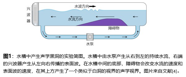 实际上在霍金提出霍金辐射不久,Unruh就注意到一个有意思的“类比”[1]:运动流体中声波的行为类似于引力背景中的标量场的动力学,在声波波速与流体流动的速度等大反向的地方会存在一个与黑洞事件视界相似的分界面。Unruh证明[1]超音速流体流动可以产生一个“哑洞”。这是一个“黑洞”的声学类比,有时也叫“声学黑洞”。流速跨越声速的区域被称作“声学视界”,它是黑洞视界的声学类比。这个类比表明,如果黑洞具有温度并存在霍金辐射的话,这个声学视界也会具有温度并向外自发辐射声子。这一个类比为实验研究黑洞的霍金辐射打开了新的思路。2011年,Unruh和他的同事首次利用如示意图1所示受激辐射实验方案尝试测量声学视界的温度并验证自发辐射是否为热辐射[6]。在实验中,为了形成一个声学视界,实验人员在一个稳定流动的水槽底部设置了一个障碍物。这个障碍物会增加流经其上方的水流流速、同时减小其上方水面的波速。如果恰当地设计水槽和障碍物、并通过水泵适当地控制总水流量,那么在水槽的水面向上游移动的波浪将遇到一个它们无法跨越的点——一个等效的白洞视界。实验人员发现系统存在受激辐射,并且波戈留波夫系数的比值随波长指数递减。利用爱因斯坦受激辐射和自发辐射之间的关系,实验人员得出结论:声学黑洞存在自发的热辐射。不过一些研究人员对这一结果是否足以确认声学视界以及验证霍金辐射仍然有异议。其中一个原因是实验中使用的物理参数并没有在所有相关频率的群速度中产生超临界区域。文献[6]的实验虽然清楚地表明由于流速的变化存在负模转换,但是这种转换似乎来自于两个不同的亚临界区域之间的散射。是否能够将文献[6]获得的指数特征视为霍金辐射存在的证据仍在争论 [7-9]。这个类比实验的第二个缺点在于实验并没有直接验证声学视界的自发声子辐射。在这个经典类比系统中,实验人员必须主动地产生声波去激发视界处的散射。虽然利用爱因斯坦自发辐射和受激辐射的关系可以理论上计算自发辐射的情况,但是这和直接验证类比视界的霍金辐射仍然有一定距离。