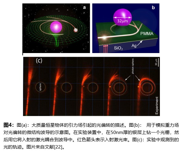 由于技术的进步,近年来人们可以实现对波导等光学微结构的高精度加工。人工光学材料被用于研究模拟弯曲时空的许多现象。这些人工光学超材料除了被用于研究诸如霍金辐射等涉及弯曲时空中的量子效应外,它们也可以被用于演示广义相对论中一些不容易被观测到的经典效应。比如文献[22]利用微结构光波导来模拟大质量恒星的引力引起的时空弯曲,用来演示引力透镜效应。文献[22]将一个微球嵌入到受控的旋涂过程中形成的平面聚合物波导(图4(b))中。考虑到表面张力效应,微球周围的波导会发生畸变,导致周围波导有效折射率发生连续的变化。在一定条件下,这样的波导可以模拟由强引力场引起的弯曲时空。利用直接荧光成像的方法,文献[22]观察到入射光会渐近地被捕获并聚集在一个不稳定的圆轨道上,如图4(c)所示。这个圆轨道正好对应于一个致密恒星物体的光子球。文献[22]实验方法为广义相对论中描述的引力透镜效应提供了一个有用的类比模型。
