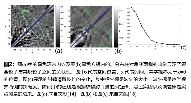 需要指出的是,也有人对 Jeff Steinhauer小组在2016年的实验结果提出了一些质疑。特别是,是否可以将上述BEC中的结果作为类比引力系统中霍金辐射的确凿证据依然还有一些争议,比如见文献[17,18]以及 Jeff Steinhauer本人的回应[19]。在笔者看来,Jeff Steinhauer小组在2016年的结果即便是正确的,也有两个不完美地地方。一方面是实验数据的精度还不够,不确定性还很大,因此所得到结果还没有足够的信服力。另一方面是实验虽然展示存在自发辐射的证据,却无法证明这个自发辐射是一个热辐射,因此也就无法验证声学视界的温度是否和声学视界的霍金温度一致。2019 年 Jeff Steinhauer 领导的小组对他们之前的实验技术进行了重大改进[16]。 图2(b)中展示的是视界两侧声子的密度关联函数,和图2(a)相比,新的结果压低了背景噪声,更加清晰地展示了两侧纠缠粒子的存在。此外,他们在实验中首次测量的声学视界附近自发辐射的声子纠缠谱函数(如图2(b)所示),从而获得了的声子辐射的温度,并发现和声学视界的霍金温度吻合。对于这一实验结果,作者目前还尚未发现有文章对其提出质疑。如果文献[16]的结果被确认是准确无误的话,这将是首次在类比引力系统中直接观测到霍金辐射并测量了相应的温度。