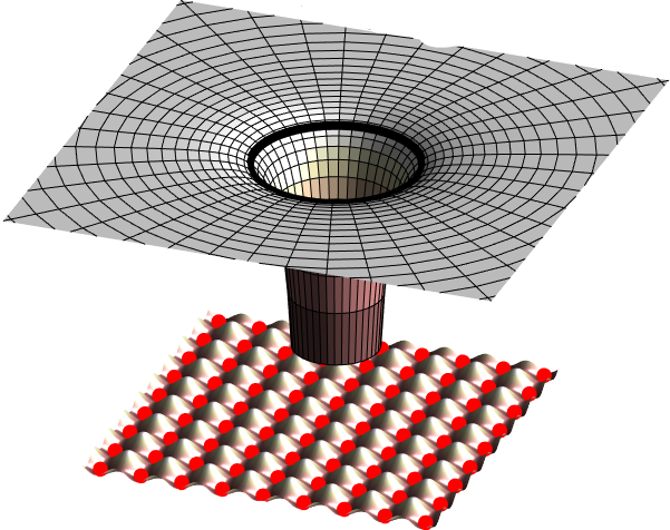 实际上从某种意义上讲,引力全息对偶本身就为类比引力的研究提供了广阔的前景。为了理解这一点,我们可以先回顾一下为什么声学黑洞可以作为黑洞的一个类比模型。对于这个问题一个明确的理论回答来自Unruh在文献[11]中的一个结论,即他证明了流体中声波的等效拉氏量都“对偶”于一个弯曲时空(包括黑洞)的标量场理论。正是基于这种“流体/声波”和“弯曲时空/标量场”的对偶关系,人们发展出来了声学黑洞和许多类比引力模型。现在引力全息对偶说的是每一个强耦合的量子场论都“对偶”于一个比它高一个空间维度,渐近反德西特时空中的引力理论。这就告诉我们可以在通过平直时空的强耦合的量子场论来模拟一类特殊引力系统的物理性质。