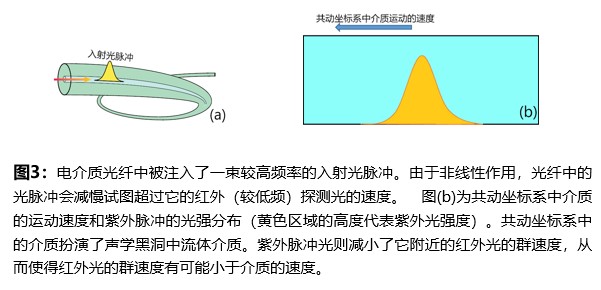 这一想法可以由图3中的示意图来解释。实验人员在一种非线性的电介质光纤首先注入一段超短脉冲紫外(较高频率)的激光。由于克尔非线性作用,光纤中的光脉冲会减慢试图超过它的红外(较低频)探测光的速度。红外探测光的折射率会随着紫外脉冲光的强度分布不同而不同。文献[20]的一个巧妙之处在于作者将参考系选择为探测光的共动坐标系。由于光纤中的光速实际上是小于真空中的光速,因此选择这样的共动参考系在物理上是允许的。在共动参考系中,入射光脉冲的位置是保持不变的,但是介质却在以相反的速度运动。以紫外脉冲的中心为对称轴,紫外脉冲的强度逐渐减小,因此红外探测光的折射率也逐渐减小。这导致介质中的红外探测光的群速度由紫外光的中心向两侧增大。如图3(b)所示,共动坐标系中的介质扮演了图1中的流体,而紫外脉冲光则扮演了图1中的障碍物,并减小了它附近的红外光的群速度。恰当地设计实验参数就可以为红外探测光制造一个等效的“光学视界”——图1水槽实验中声学视界的“光学版本”。文献[20]在实验中观测到了光学视界附近的红移和蓝移。他们通过理论计算表明这样的系统存在霍金辐射。最近 Leonhardt 在文献[21]报道他们在这个模型尝试对霍金辐射的验证和测量的结果。他们发现了霍金辐射存在的证据,不过实验结果未能获得类似于霍金辐射的黑体能谱。