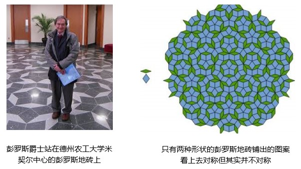 罗杰·彭罗斯爵士是英国著名数学物理学家。因为在黑洞理论研究中的杰出成果,他与发现银河系中心超大黑洞的两位天文学家共同获得2020年诺贝尔物理学奖。黑洞是爱因斯坦理论的一个重要预言。彭罗斯及其与霍金合作的黑洞理论研究成果非常深奥,没有专业训练(甚至经过专业训练也)是很难理解的。在量子交叉中心(cjqs.tju.edu.cn)科普页面可以查到中心老师杨润秋与中科院理论所学者合作的对彭罗斯黑洞研究成果的全面的精彩科普。彭罗斯本人兴趣广泛,知识渊博,一些有趣的成果及哲学思考完全可以被普通老百姓所理解。比如彭罗斯地砖,就可以在日常生活中直接应用。彭罗斯地砖局部看上去是对称周期的,但视角扩大之后,就会发现并非周期,但依然可以无缝隙地平铺整个平面。如果在数学学院或物理学院的大厅铺一层能体现出浓浓高端学术氛围的彭罗斯地砖,访问人员往往会不由自主地探索其非周期性。